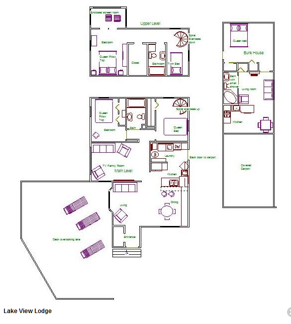 With a superb view of the lake and ample room for family and friends, the Lake View Lodge is a 3-bedroom/2-bathroom lodging with 3 Queen beds and a twin bed. The Lake View Lodge has extra room for fun with a 1-bedroom, 1/2 bathroom bunk house, as well.
