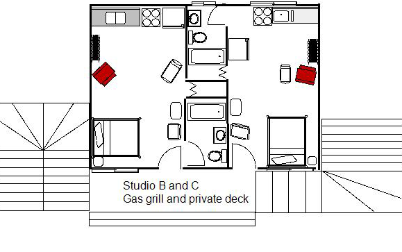 This queen bed, 1-bathroom studio offers all the comforts of home in a smaller package. Enjoy the deck, with its grill, picnic table, and chairs and fully equipped kitchen. This is the perfect place to enjoy your meals and spot the deer as they meander by.